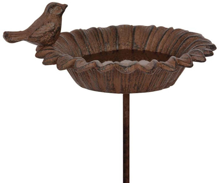Antik barna öntöttvas madáritató és etető virágformával és kismadár díszítéssel. Könnyen a földbe szúrható és áthelyezhető, praktikus és hasznos termék. Az itatás és etetés könnyebbséget és biztonságot jelent a környék madarainak, akik madárcsicsergéssel hálálják meg a gondoskodást. Öntöttvas jellegéből adódóan külső elhelyezés esetén, a korrózió megjelenésével egy patinásabb, rusztikusabb termék válik belőle. Tedd vele hangulatossá kertedet és élvezd a kismadarak társaságát!