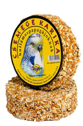 Trópus mézes karika hullámos – Ízletes és szórakoztató csemege kismadaraknak Minden madárgazda tudja, hogy a tollas barátok élete nemcsak a magokról, hanem a mentális stimulációról és a változatos ízekről is szól. A hullámos papagájok különösen intelligens és aktív lények, akiknek szükségük van olyan kihívásokra, amelyek lekötik a figyelmüket. A Trópus mézes karika nem csupán egy egyszerű jutalomfalat, hanem egy interaktív eszköz, amely segít elűzni az unalmat, miközben értékes tápanyagokkal és természetes mézzel kényezteti kedvencedet. Miért válaszd ezt a megoldást? Ez a csemege kettős célt szolgál: táplál és szórakoztat. A ropogós magkeverékbe zárt természetes méz ellenállhatatlan vonzerőt jelent a madarak számára, így kiválóan alkalmas a bizalom építésére vagy a kézhez szoktatáshoz. A karika forma arra ösztönzi a papagájt, hogy aktívan dolgozzon meg az élelemért, akárcsak a természetben. A függesztett kialakítás révén a madárnak egyensúlyoznia, rágcsálnia és mozognia kell, ami hozzájárul a fizikai kondíció megőrzéséhez és a csőr egészséges koptatásához. a Trópus mézes karika 5 legfontosabb jellemzője 1. Természetes mézes ízesítés A méz természetes energiát ad és olyan édes ízélményt nyújt, amelynek egyetlen hullámos papagáj sem tud ellenállni. 2. Csőrkoptató hatás A keményre sütött magok rágcsálása közben a madár természetes módon koptatja a csőrét, megelőzve a túlnövést. 3. Praktikus függeszthető forma A karika alakú kialakítás lehetővé teszi a könnyű rögzítést a ketrec rácsaira, így bárhová elhelyezhető a röpdében. 4. Mentális stimuláció A csemege megszerzése közben a madárnak "dolgoznia" kell, ami segít megelőzni a bezártságból adódó unalmat és stresszt. 5. Válogatott magösszetétel Kifejezetten a kisebb testű díszmadarak igényeihez igazított alapanyagokból készült, biztonságos kiegészítő eledel. Kinek ajánlom ezt a terméket?